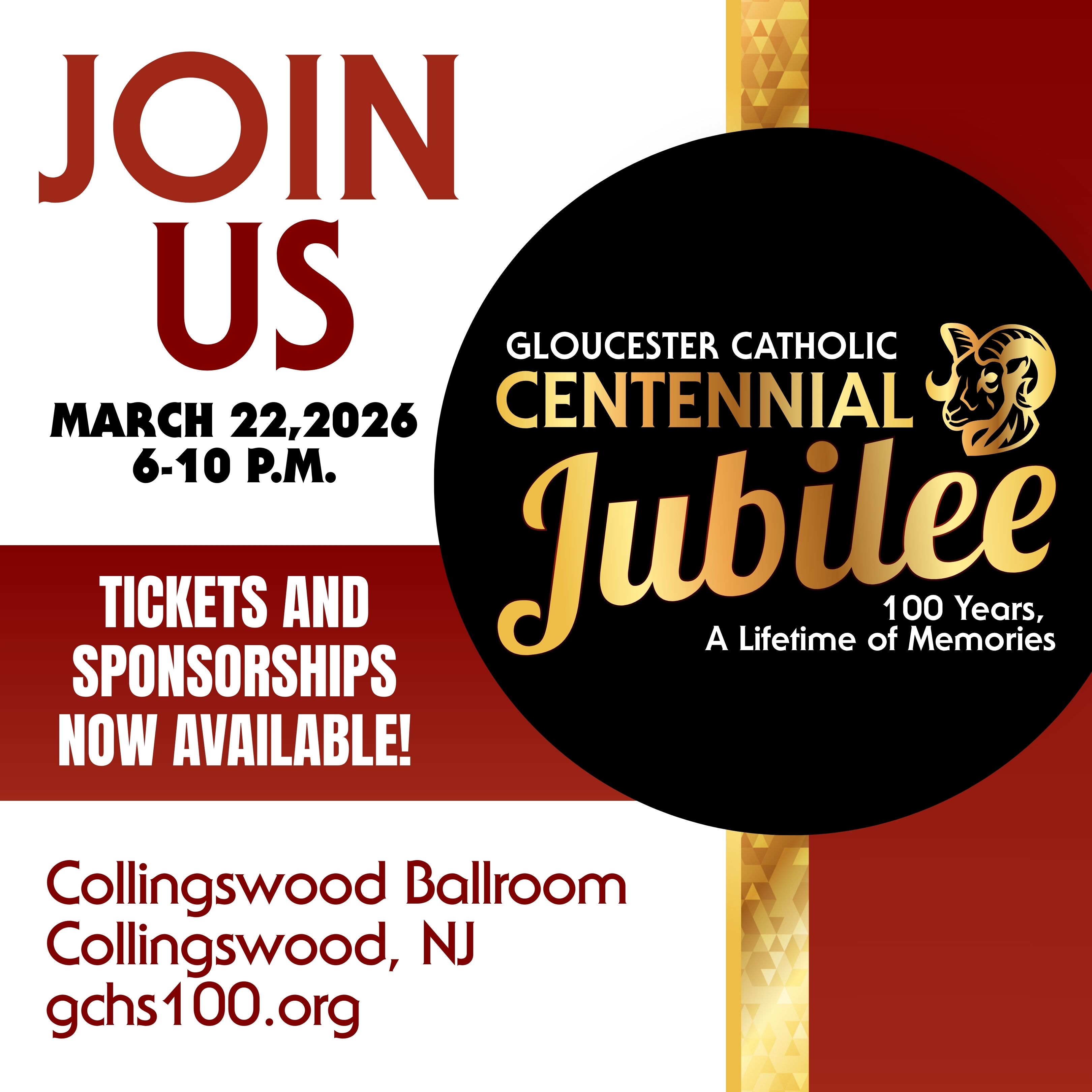 Centennial Jubilee, Sunday, March 22nd, 6 PM, Collingswood Ballroom, Collingswood, NJ. Tickets: $150 (includes open bar)- Tickets available now.